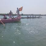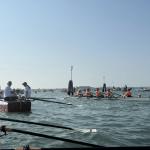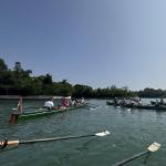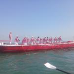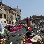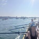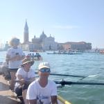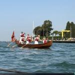 Sonntag ging es früh aufs Wasser. Die Barke wurde per Kran eingesetzt, da die Slip-Rampe am Ruderclub völlig ungeeignet für das Einsetzen von Booten über 5m war. Noch einmal vielen Dank an die Ruderer von Società Canottieri Treporti. Als erstes mussten wir zum Startpunkt der Vogalonga direkt vor dem Markusplatz kommen. Das waren zunächst einmal knapp 10km bevor es richtig los ging. Im Startbereich versammelten sich dann erst mal 2000 Boote vom Einer-Kanu bis zur 16er Gondel war alles vertreten. Kanus, Ruderboote nach englischem Stil, nach venezianischen Stil, Barken, Kirchboote, Standup-Paddler, Drachenboote. Mit dem Kanonenschuß wurde um 9 Uhr gestartet, alles setzte sich in Bewegung. Zunächst war noch genug Platz, aber an der ersten Kurve bei Sant Elena wurde es eng. Unsere Barke versucht sich in der Außenkurve zu halten. Um unsere Barke hatten wir weniger Angst, eher um alle anderen. Bei einigen Teilnehmer fehlte ein wenig das Risikobewußtsein. Was auch zu einigen Havarien führte. Wir sahen ein gekenteres Drachenboot und paar abgesoffene Ruderboote. Später hörten wir auch von einigen Problemen mit weiteren vollgeschlagenen Booten. Eigentlich war nicht viel Wind, aber für einige Bootstypen war das anscheinend schon zu viel. Da wir außer der Barke nur 5 D- und E-Vierer dabei hatten, gab es für uns gar keine Probleme. Bei Sant Erasmo staute es sich etwas, aber danach war die Strecke recht gerade. Erst bei Burano wurde es wieder enger aber auch hier gab es kaum Probleme. Danach ging es über die offene Lagune Richtung Murano mit etwas Gegenwind. Mit Murano als Windschutz machten wir eine Pause und warfen auf der Barke den Grill an. Einer unser Vierer kam längsseits und orderte auch Grillwürstchen. Murano liegt bereits kurz vor Venedig und hier wurde es extrem eng. Man biegt zunächst in den Canal Cannaregio ein, der ist schon recht schmal. Die erste Brücke “Tre Archi” hat leider nur einen Bogen den man durchfahren kann. Der Veranstalter hatte hier ein Team von Froschleuten im Wasser, um das größte Chaos zu verhindern. Auch wenn eine mittelgroße Gondel sich in selbstmörderischer Absicht direkt vor unseren Bug drängelte, kamen wir gut durch. So eilig hatte wir es dann auch wieder nicht. Danach trifft man auf den Canale Grande, da hat man mehr Platz. Allerdings bekommt man dann Gegenverkehr, da Boote vom Ziel kommend zurück zum Festland rudern. Wir sackten unsere Medaillen ein und machten etwas abseits des Trubels erst einmal eine Pause. Jetzt setzte auch der Motorbootverkehr wieder ein. Teilweise heftiger Wellengang begleitete uns bis zum Lido, danach wurde es etwas entspannter. Noch der Hinweis für Nachahmer: natürlich kann man die Vogalonga auch im gedeckten C-Boot machen, aber besser sind Wanderboote und wer ohne Abdeckung rudert, der wird sich in der Statistik für abgesoffene Boote wieder finden.