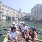 Der nächste Tag wurde dann sehr lästig. Wegen Bauarbeiten an den Tunneln hinter Salzburg stand der Barkenanhänger fünf Stunden im Stau. Der andere Bootsanhängertransport hatte, dank kreativer Beifahrerin eine Umleitung durch die Berge genommen. Betonung liegt auf “durch die Berge”. 60 km bergauf und bergab, immer mit 15% Steigung bzw. Gefälle. Mit glühenden Anhängerbremsen erreichten wir Italien, aber immmerhin waren wir am Spätnachmittag in Punta Sabbioni und konnten die Boote beim Ruderclub Treporti abladen. Viele der Ruderer waren bereits mit Flugzeug und Vaporetto angekommen, so dass genug Leute da waren. Die Barke traf erst gegen 21 Uhr ein.