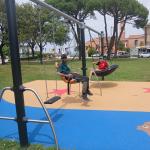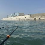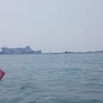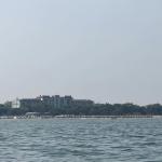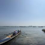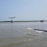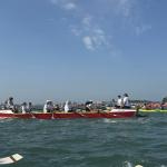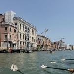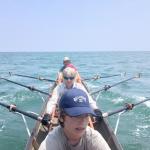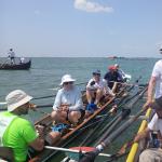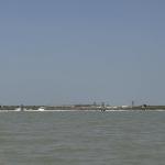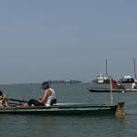 Der nächste Tag versprach Windstille. Daher sollte es auf die Adria gehen. Wir wollten den Lido umrunden. Zunächst auf der Lagunenseite vorbei am Lido. Vor der Anlegestelle gab es heftigen Vaporetto Verkehr. Da mussten wir schon mal warten bis 3-4 Vaporettos an/abgelegt hatten, bevor es weiter ging. Danach war die Strecke aber sehr entspannt. Weiter südlich am Lido ist nicht mehr viel los. Auch die Häuser werden hier wieder einfacher, die Prunkbauten sind im nördlichen Teil. Wir umrundeten das Südende des Lido und ruderten auf die Adria. Parallel zum Strang ging es weiter nordwärts. An einem Strand legten wir an und genossen das warme Wasser und die Sonne bei 30 Grad. Nach der Pause ging es nördlich des Lido wieder auf die Lagune und zurück nach Punta Sabbioni. Anders herum hätten wir heute auch nicht rudern können, da am Morgen das Hochwassersperrwerk (Mose) geschlossen war. Gut das der Probelauf am Nachmittag beendet war, sonst wären wir nicht auf die Lagune zurück gekommen. Unser Plan B wäre gewesen am Außenstrand von Punta Sabbioni anzulegen.