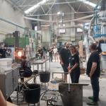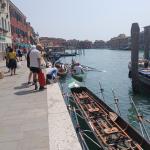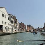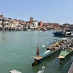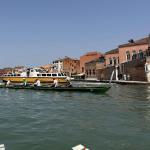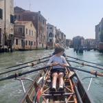 Mit den fünf Vierern ging es heute nach Murano, zur Glasbläserinsel. Wegen einer Brückenbaustelle war die Hauptdurchfahrt gesperrt. Daher fanden wir ziemlich enstpannt Liegeplätze für unsere Boote und erkundeten die touristischen Highlights. Der Tip bei Mazzega Glas Factory wurde in einer großen Halle wirklich mit vielen ArbeiterInnen produziert. Es sah nach mehr aus als nur eine Show-Produktion. Die Betonung der weiblichen Form ist mit Vorsatz, mehr als die Hälfte des Produktionspersonals war weiblich. Nach der Pause ging es über einen schmalen Kanal Richtung Norden durch Murano. Simone hat einen späten Flug gebucht und musste zum Flughafen gebracht werden. Der Weg zum Flughafen war eigentlich nicht allzu weit, aber angesichts des Verkehrs an schnellfahrenden Taxis, bogen vier Boote ab und machten sich auf den Rückweg. Das letzte Boot hatte wirklich eine interessante Fahrt zum Flughafen, aber wir raten dringend ab, das nachzumachen. Die Fahrrinne ist schmal und die Motorboote rasen. Neben der Fahrrinne ist nur wenig Platz und die halb überfluteten Wellenbrecher sind schwer zu sehen. Wir kamen heil an, setzte Simone ab und kamen auch wieder raus. Als Abschluss gönnten wir uns noch eine halblegale Durchfahrt durch Venedig bei vollem Verkehr, das schreckte uns jetzt auch nicht mehr.